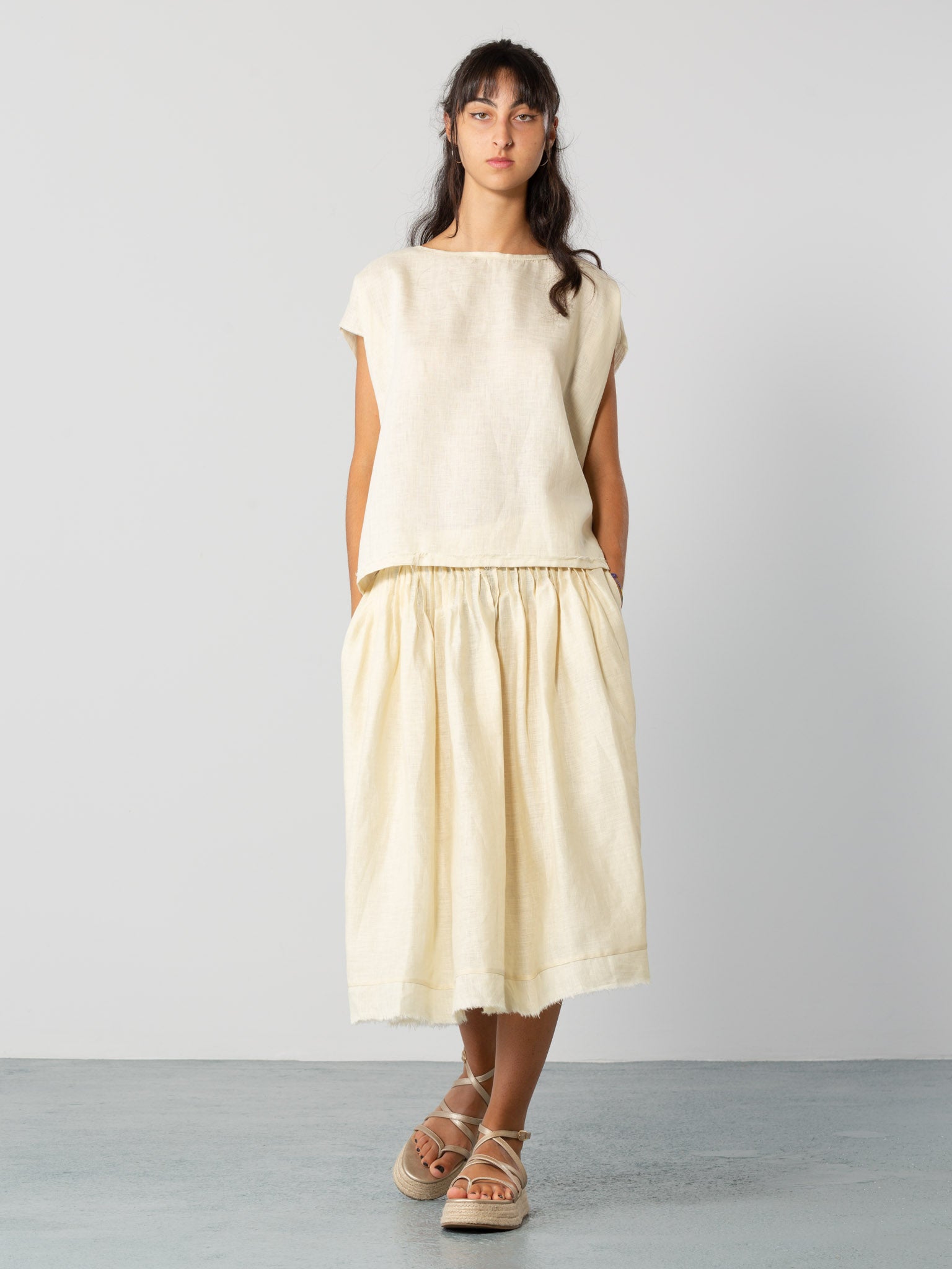 Top sin mangas. Bajo y cuello con acabado en crudo. Tejido de lino suave y ligero, muy agradable al tacto. Fácil y cómodo de llevar, adecuado tanto para pantalones como para faldas.