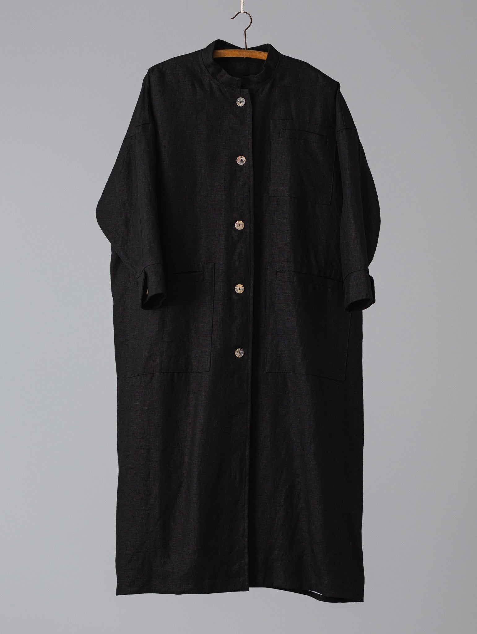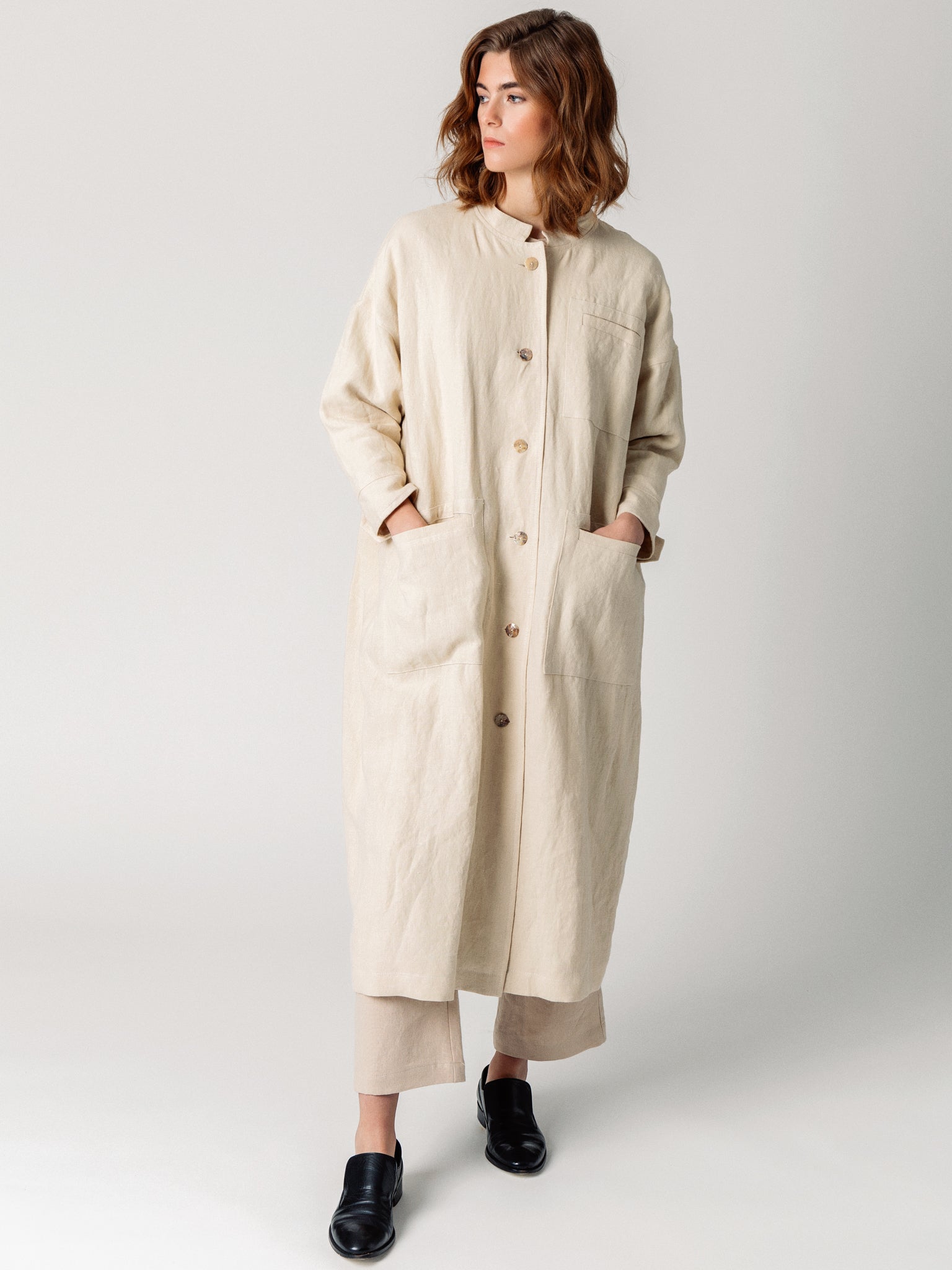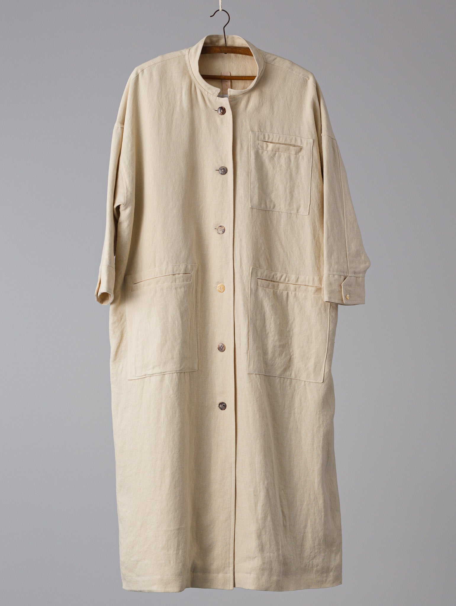 Abrigo largo. Corte holgado, mangas largas con puños abotonados, sisa baja, cierre con trabilla, tres bolsillos (uno en el pecho) y bolsillos con pespuntes.