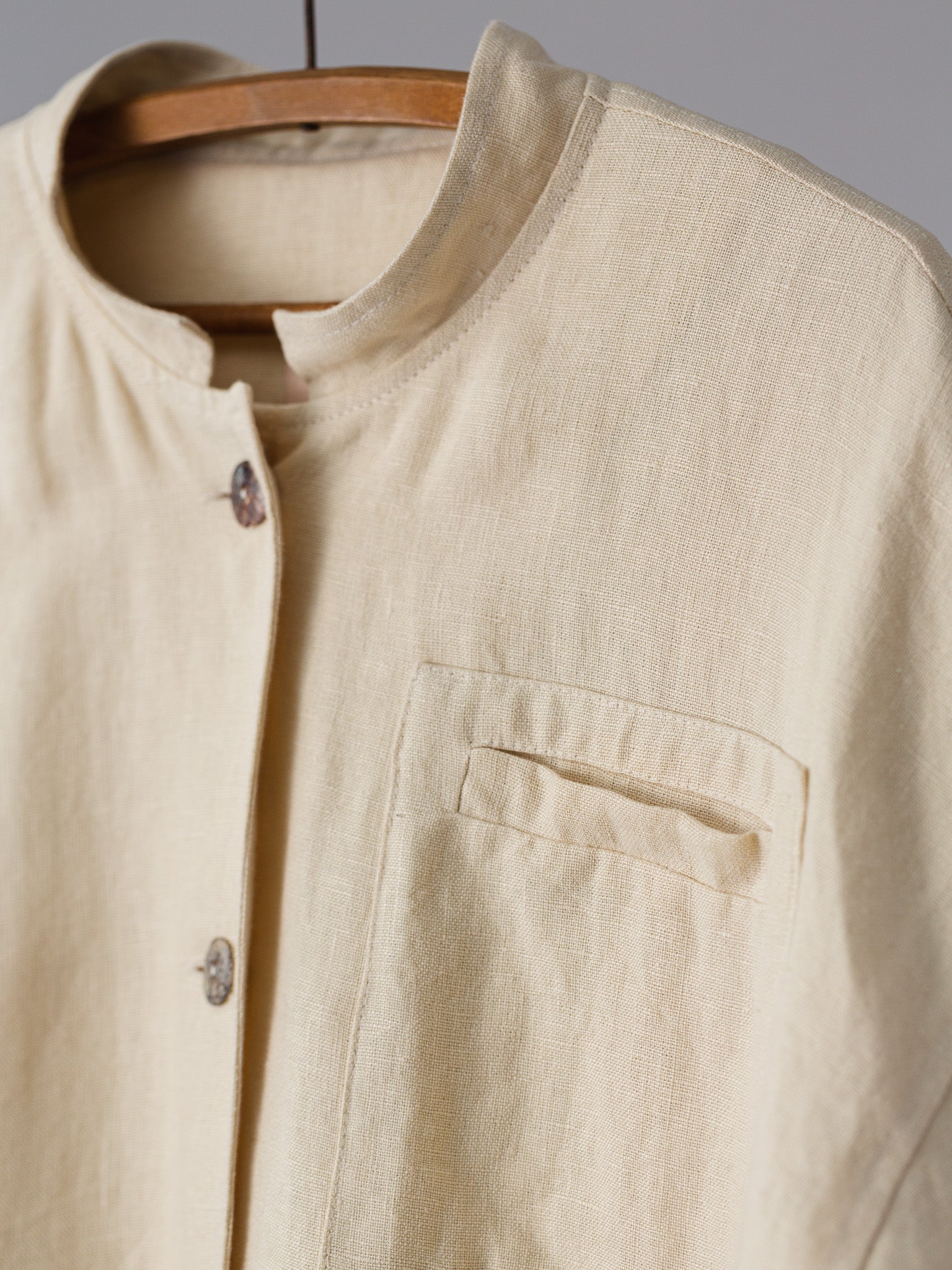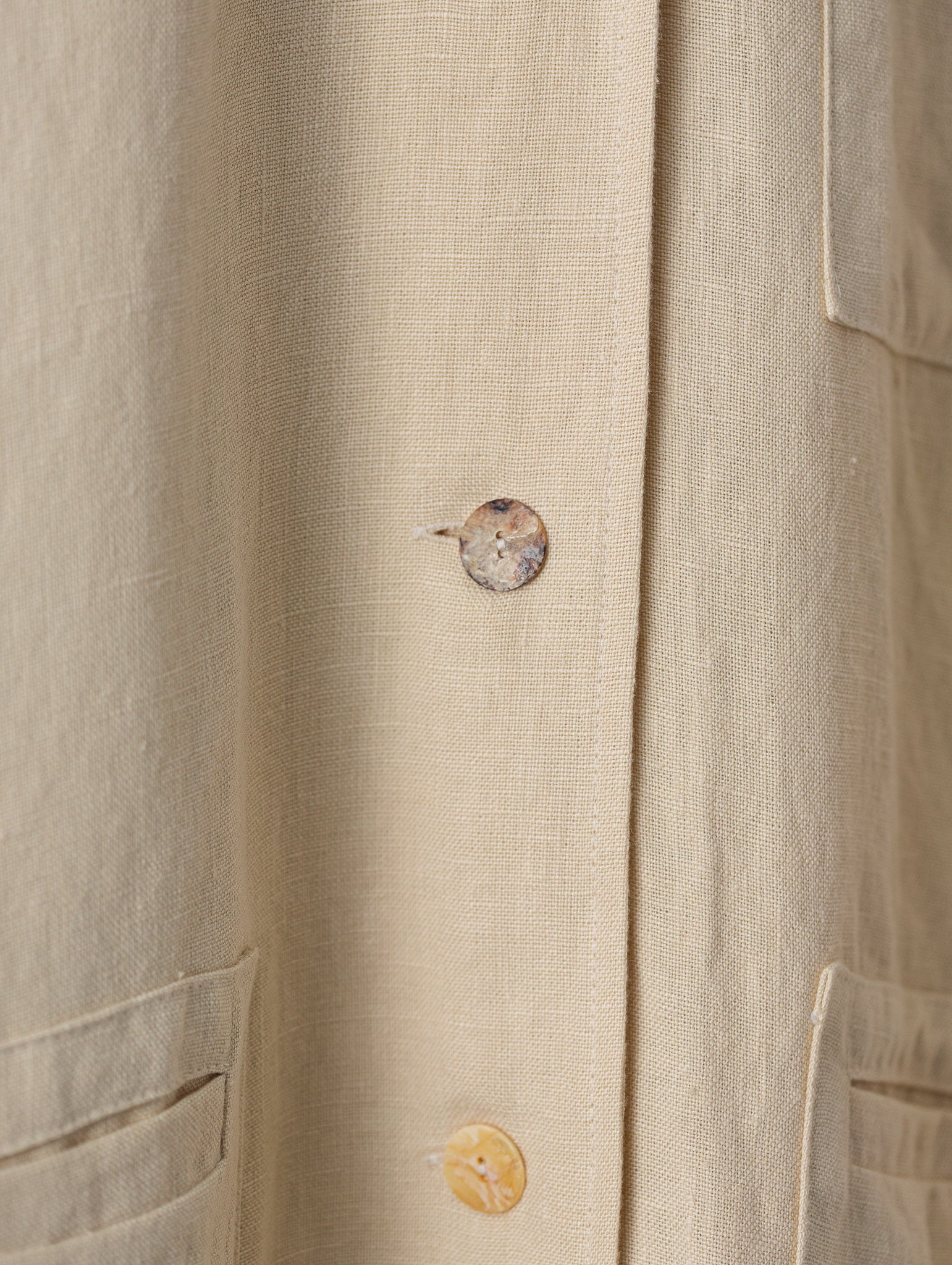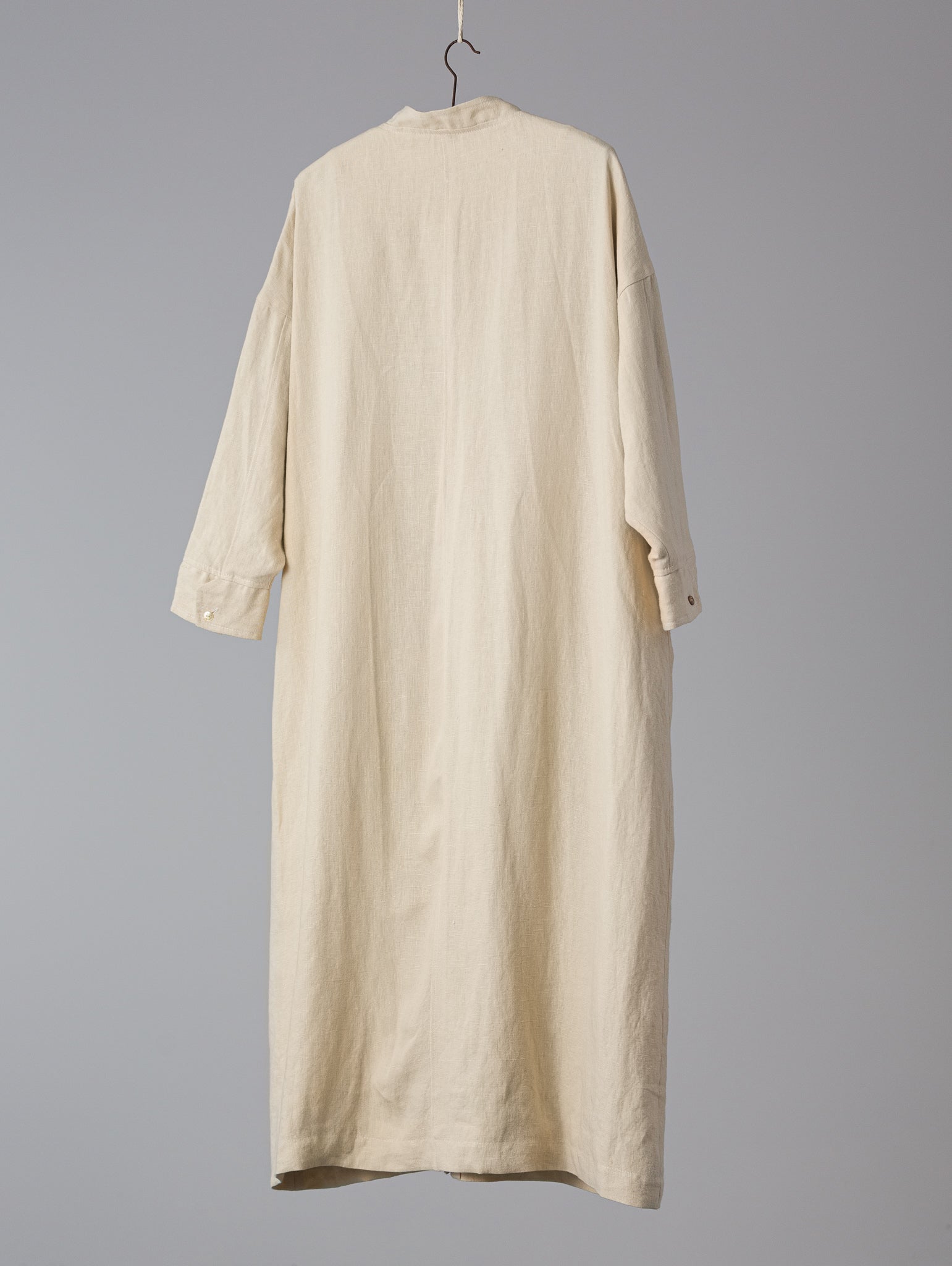 Abrigo largo. Corte holgado, mangas largas con puños abotonados, sisa baja, cierre con trabilla, tres bolsillos (uno en el pecho) y bolsillos con pespuntes.