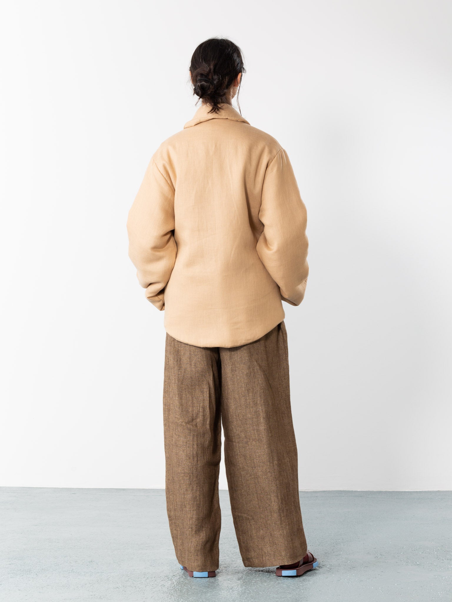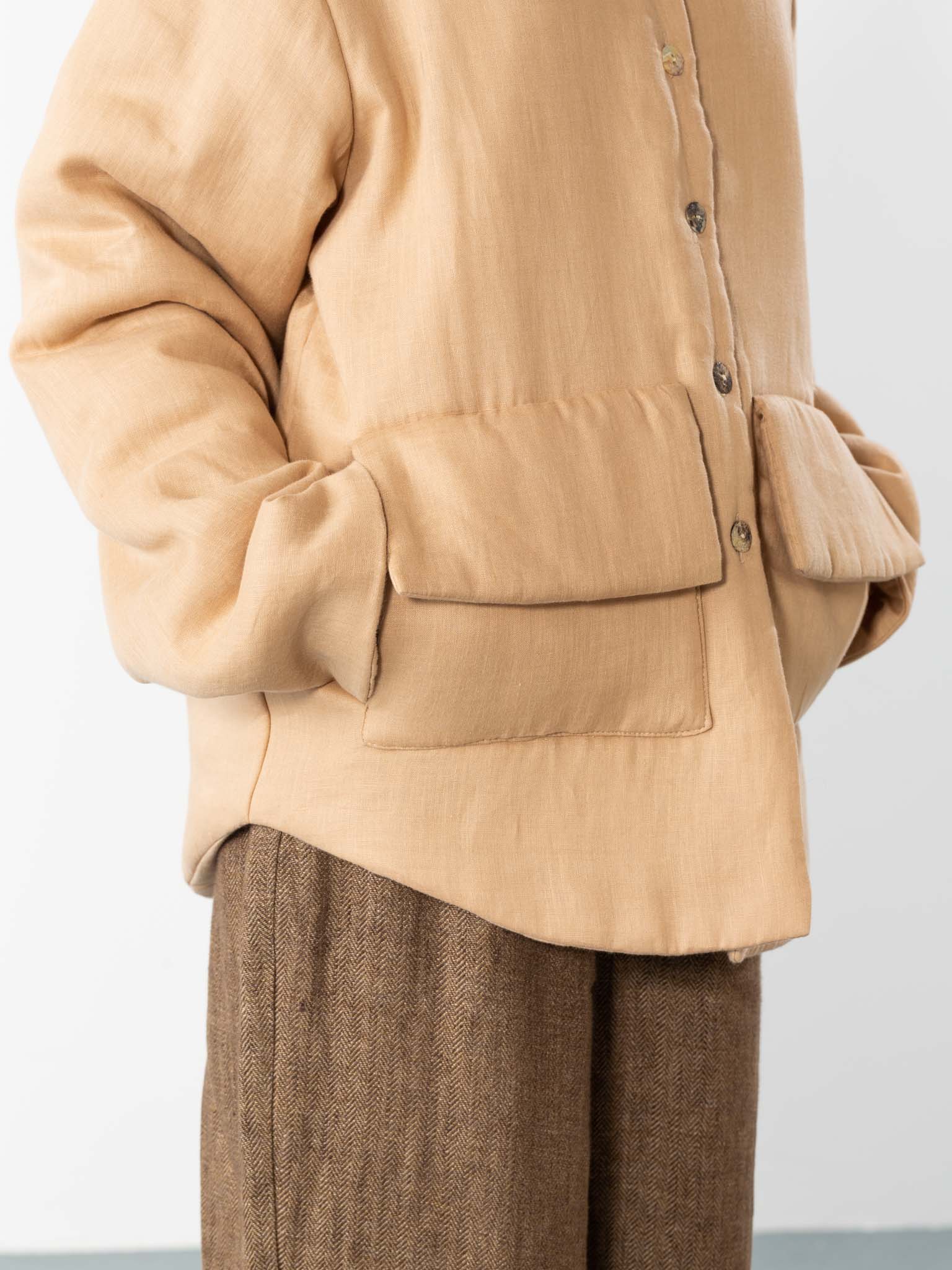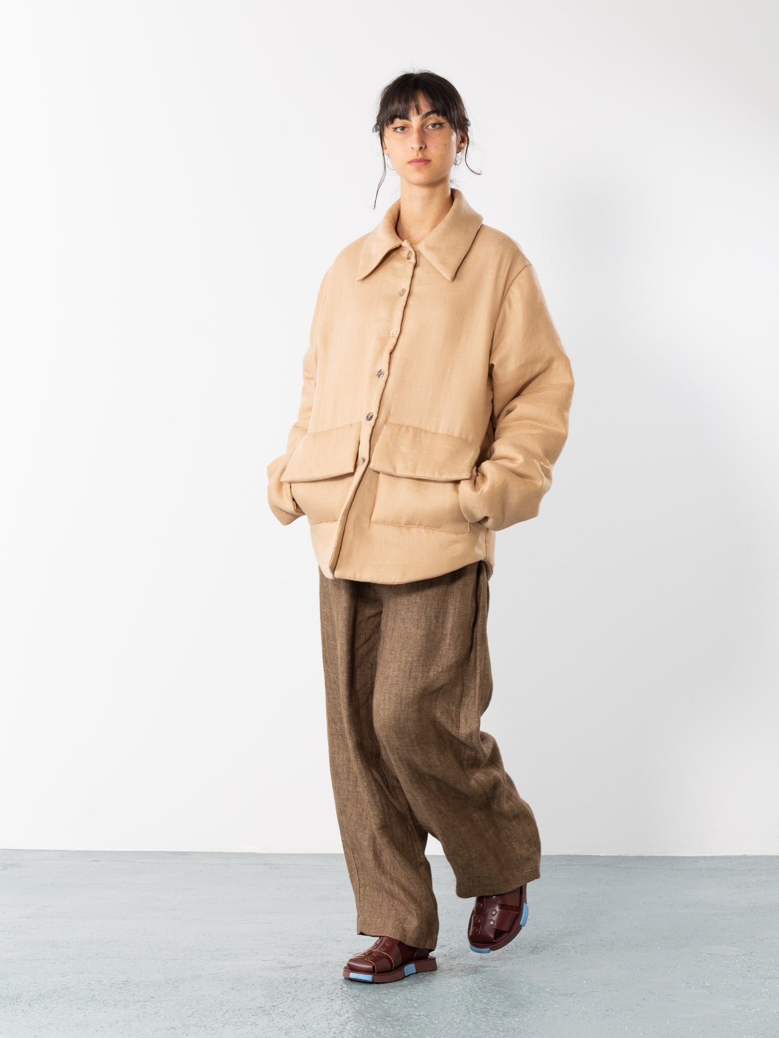 Chaqueta de invierno completamente acolchada. Mangas caídas tipo drop shoulder. Estilo sin género. Dos bolsillos laterales acolchados con solapa. Silueta limpia tipo bata que permite usarla como chaqueta independiente o como capa interior debajo de un abrigo oversize. Puños largos y largo por debajo de la rodilla. Relleno de poliéster reciclado.