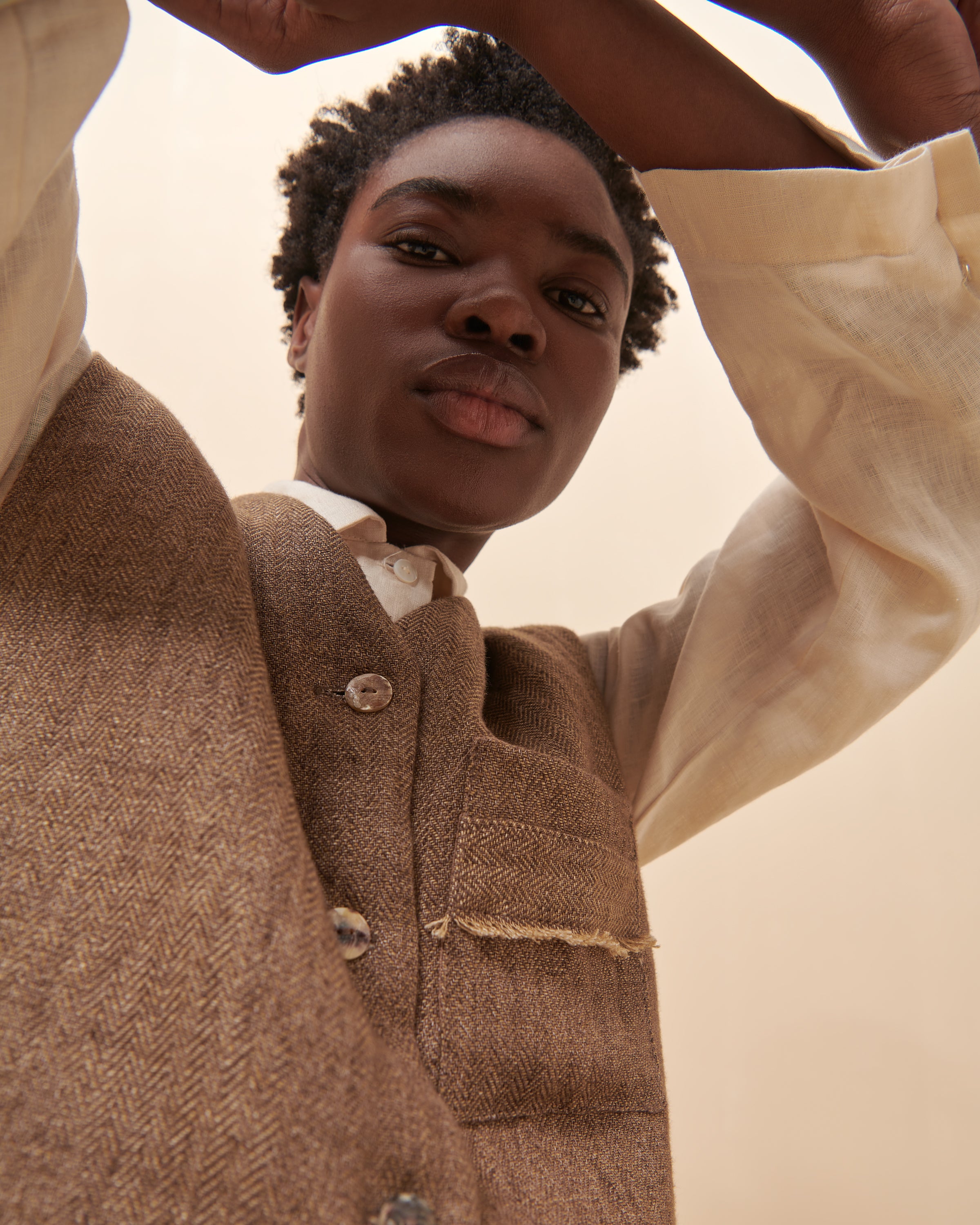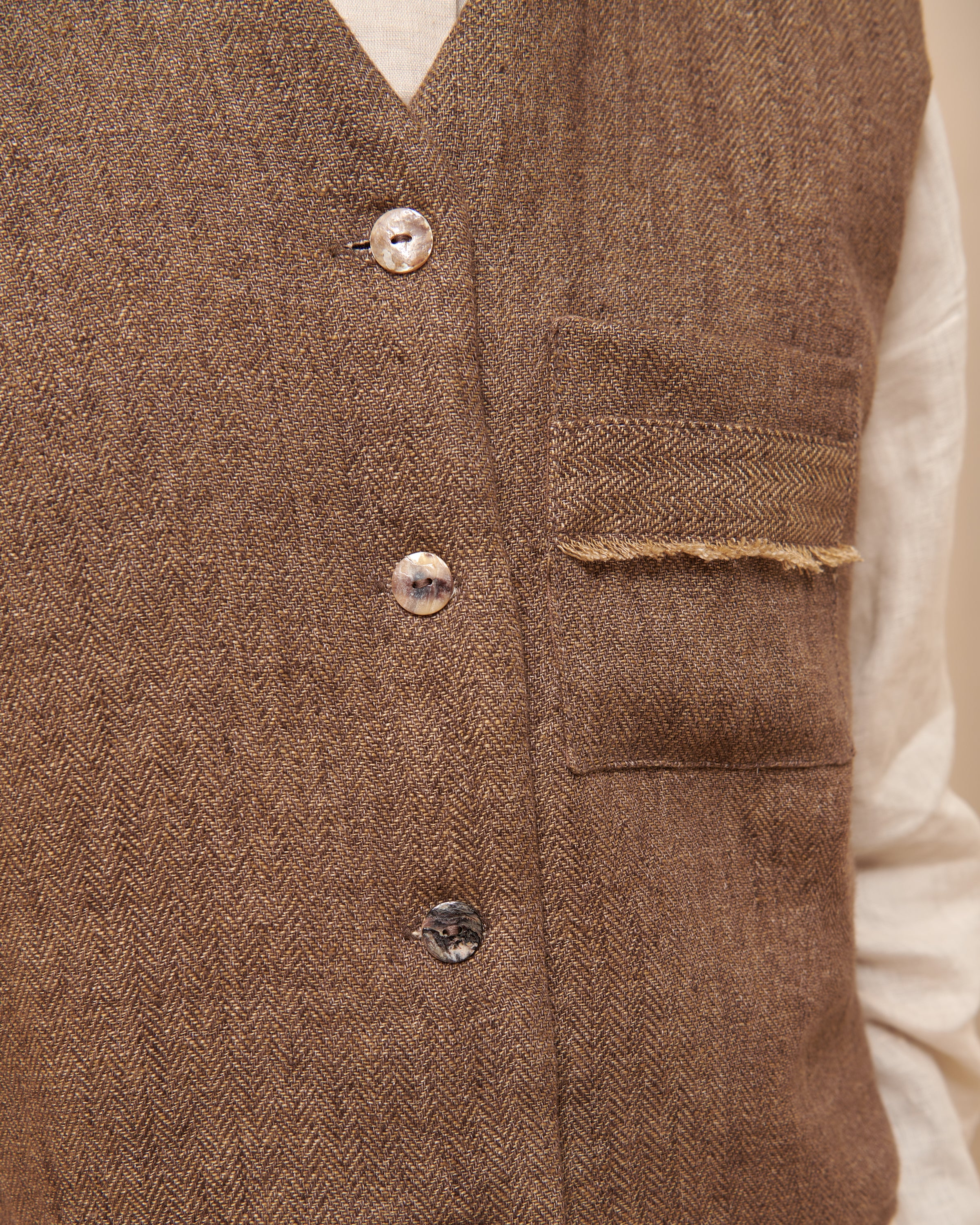 Chaleco en lino espiga. Relleno de 100% lana. Forrado en 100% lino. Manga al hombro con bolsillo en parte superior izquierda con detalle desflecado. Cerrado con botones de nácar.