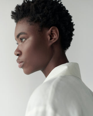 Silueta amplia y relajada. Cuello con lazo. Camisa de corte bajo con cierre frontal. Mangas de hombros caídos, amplias hasta el codo, fruncidas en la parte superior del hombro y los puños. Canesú con frunces en la espalda. Bajo redondeado.